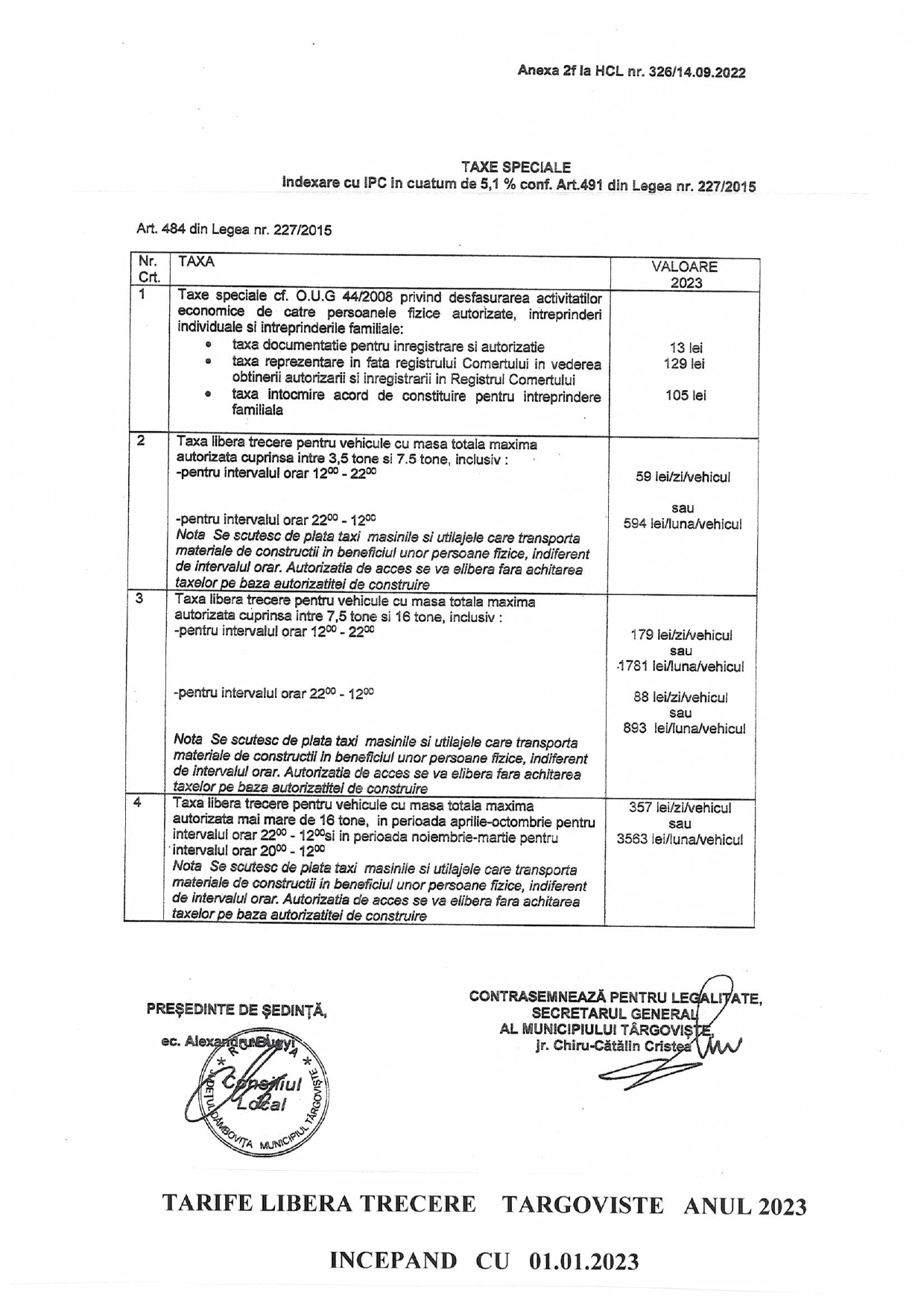 Taxa liberă trecere pentru autovehicule prin municipiul Târgoviște în anul 2023