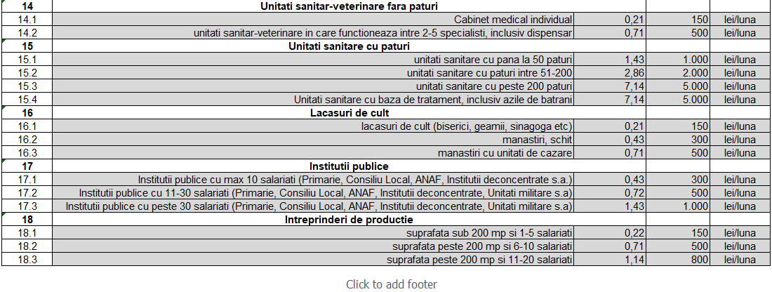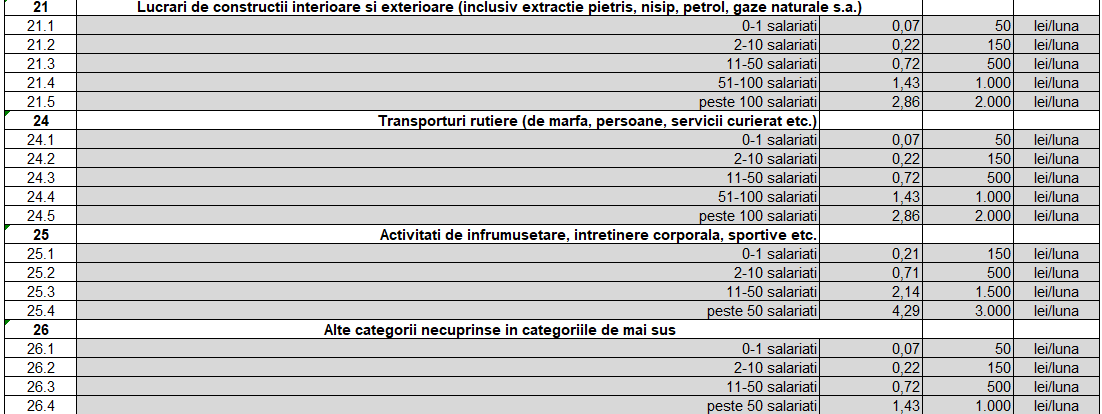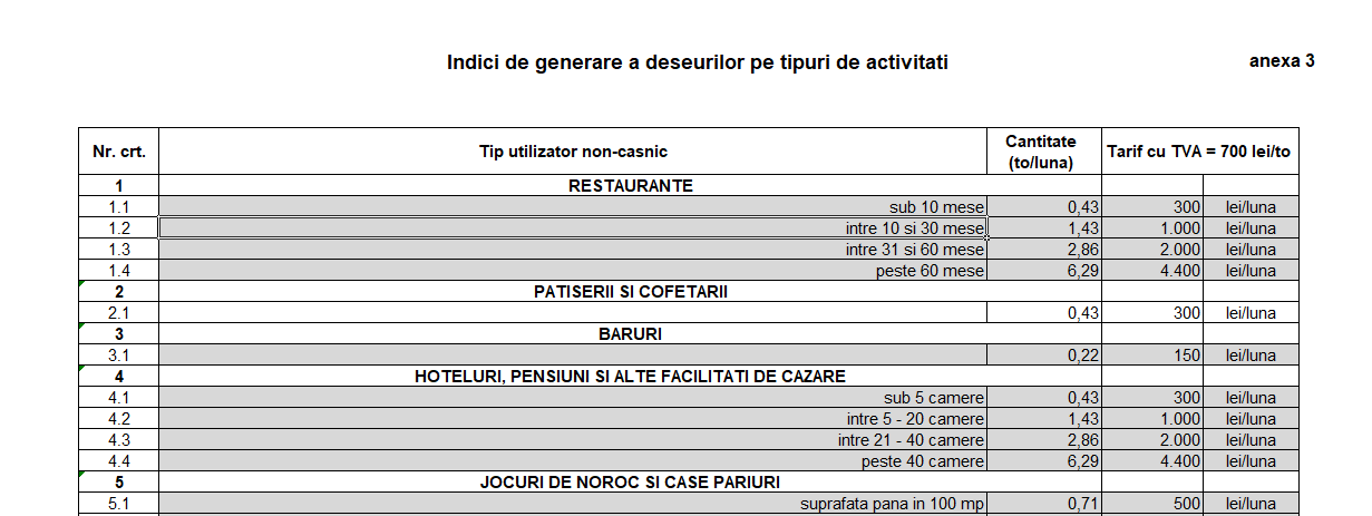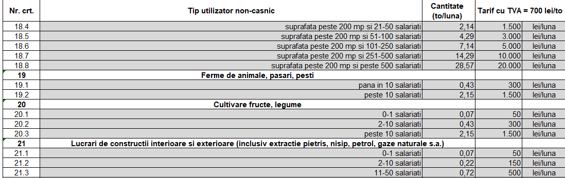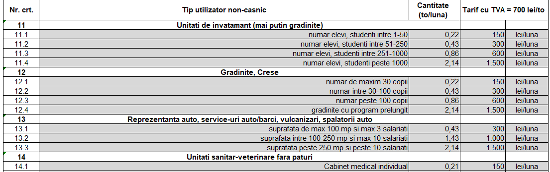 Taxele sunt cuprinse între 50 de lei până la 20.000 de lei pentru firmele mari, iar modul în care au fost împărțite aceste sume pe tipurile de activitate, nu sunt justificate de cantitatea de gunoi produsă. Cum și cine măsoară exact cât gunoi produce un angajat al unei firme? Dacă o firmă cu un singur angajat va plăti 50 de lei, următorul prag care cuprinde 2 până la 10 angajați, va fi taxat cu 150 de lei. O socoteală cel puțin ciudată..și nejustificată, în condițiile în care, pentru persoanele fizice, o familie plătește 32 de lei lunar.