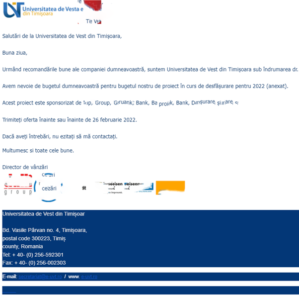 Notă: Alăturăm mai jos, pentru exemplificare, o captură de imagine a mesajului primit pe adresa de e-mail a unuia dintre partenerii UVT (mesaj din care au fost eliminate o serie de nume și mărci, pentru respectarea imaginii acestora).