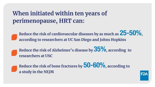De asemenea, femeile își pot reduce riscul de boli cardiovasculare cu până la 50%, de boala Alzheimer cu 35% și de fracturi osoase cu 50 până la 60%. Deși momentul începerii THS și durata utilizării sunt decizii luate între medicul prescriptor și pacientul individual, recomandarea FDA va fi începerea THS în termen de 10 ani de la debutul menopauzei sau înainte de vârsta de 60 de ani pentru THS sistemică.
