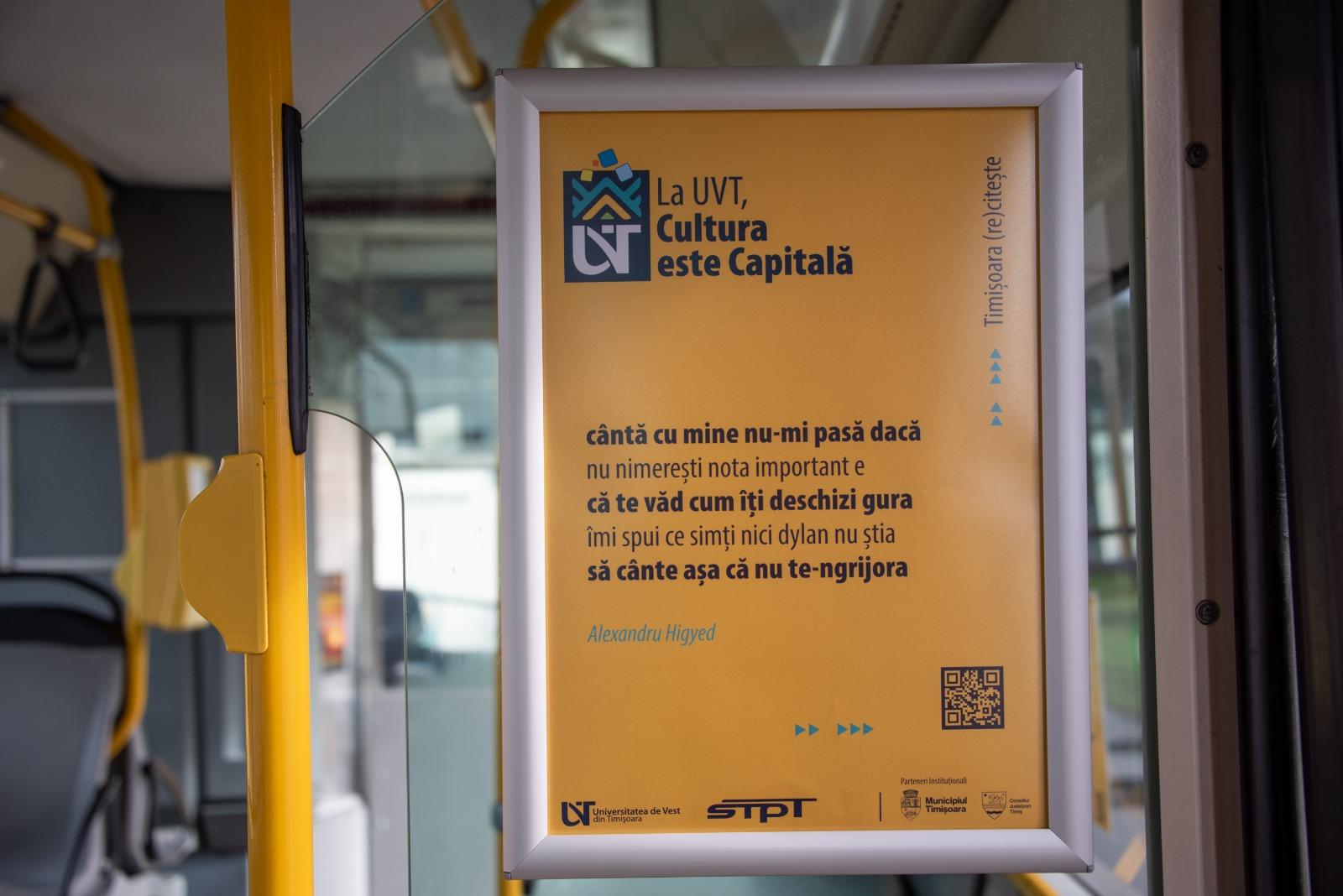 Universitatea de Vest din Timișoara, în parteneriat cu Societatea de Transport Public Timișoara, lansează un proiect ambițios de încurajare a lecturii numit Timișoara (re)citește. Începând de azi, cei care urcă în tramvaiele, autobuzele, microbuzele și troleibuzele STPT vor putea citi versuri scrise de poeți bănățeni contemporani.