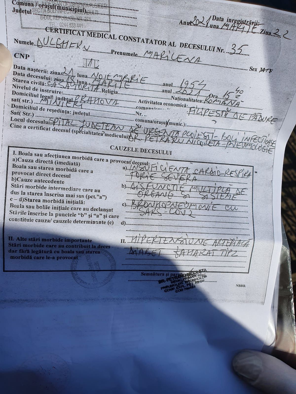Pe certificatul de deces al soțului său, Gheorghe Dulgheru (71 ani), figurează infecția cu coronavirus, insuficiență cardio-respiratorie severă, cardiopatie ischiemică și hipertensiune arterială.