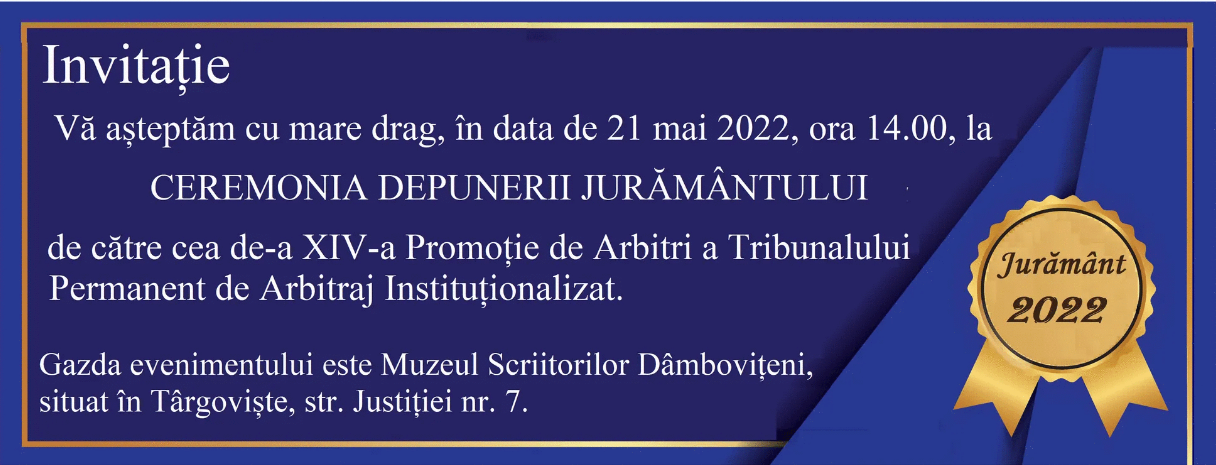 Tribunalul Permanent de Arbitraj Instituționalizat vă invită sâmbătă, 21 mai 2022, ora 14.00, la Ceremonia depunerii Jurământului de către cea de-a XIV-a promoție de arbitri.