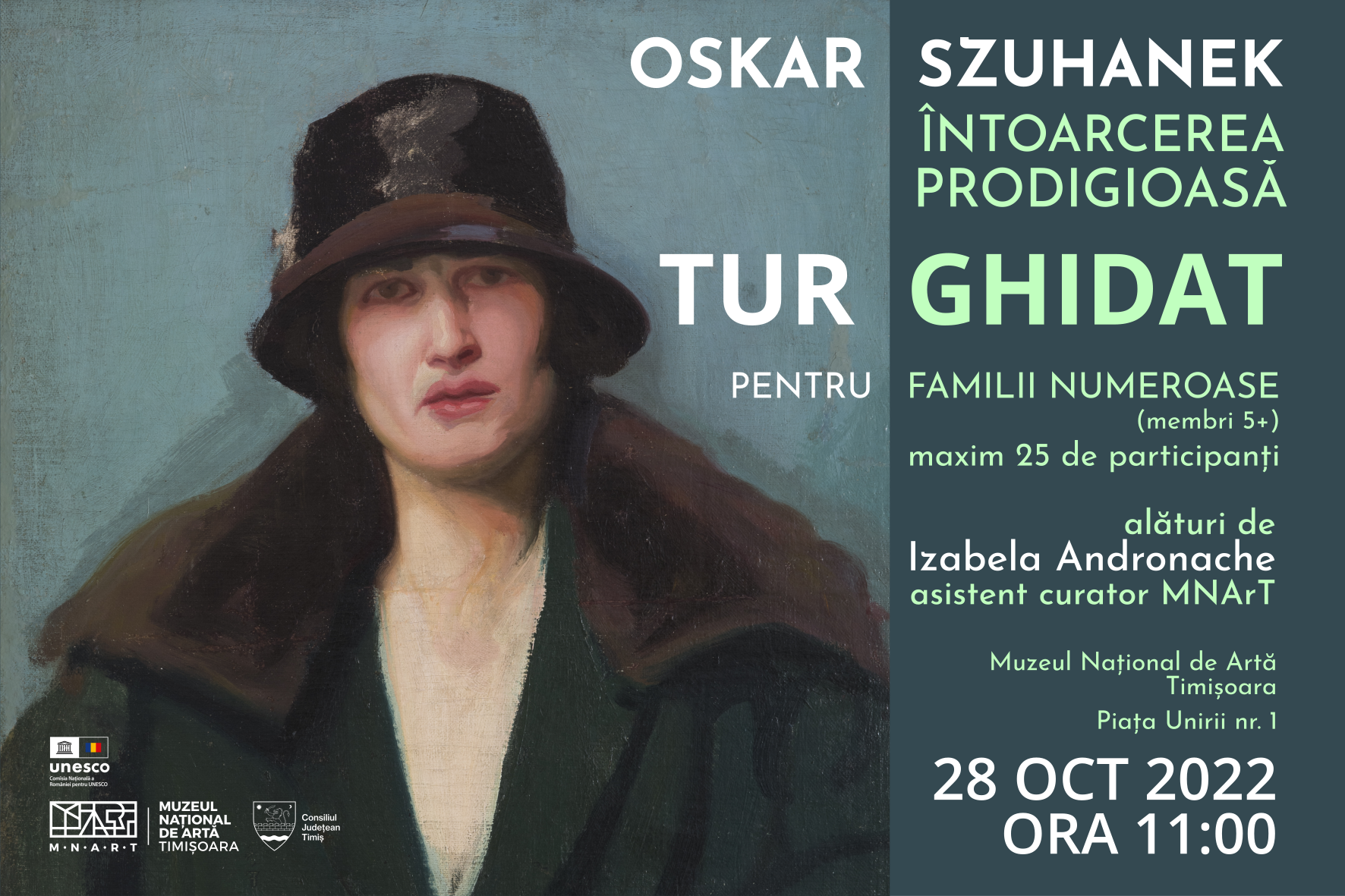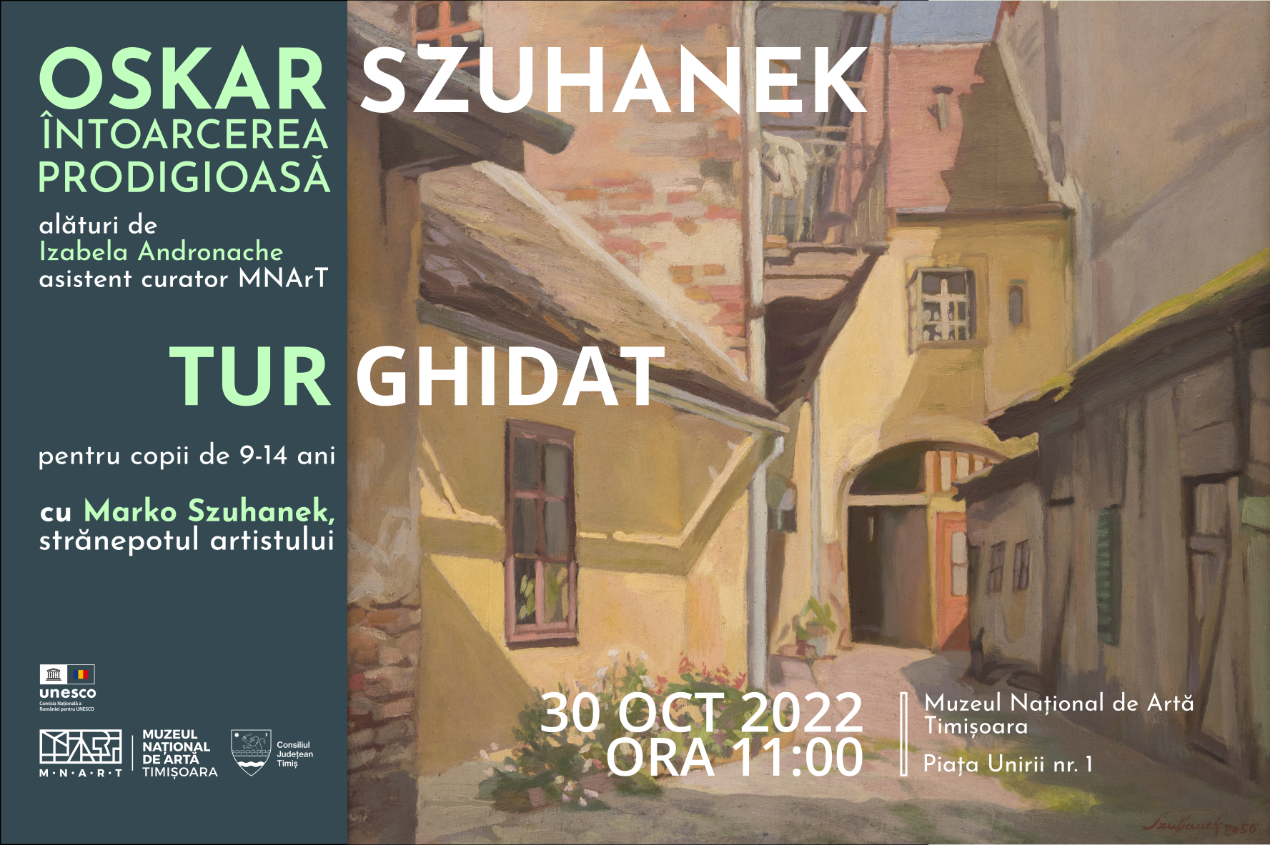 Muzeul Național de Artă Timișoara anunță organizarea a două tururi ghidate în zilele de 28 și respectiv 30 octombrie 2022, ora 11.00, în expoziția „Întoarcerea Prodigioasă. Oskar Szuhanek”. Primul eveniment se adresează, cu precădere familiilor numeroase și va fi realizat de dra Izabela Andronache, în timp ce al doilea tur ghidat îl va avea drept protagonist pe Marko Szuhanek, strănepotul artistului, fiind un tur adresat celor mici, cu vârste între 9-14 ani. Datorită configurației spațiului expozițional pot fi organizate grupuri de maxim 20 de persoane pentru un tur, iar participarea este gratuită.
