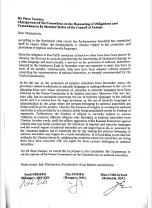 Comisia de monitorizare a Adunării Parlamentare a Consiliului Europei (APCE) a adoptat, în unanimitate, moțiunea pe care a inițiat-o, senatorul Titus Corlățean, ca membru al Delegației Parlamentului României la Adunarea Parlamentară a Consiliului Europei, prin care Comisia de monitorizare a Adunării solicită oficial Comisiei pentru Democrație prin Drept (Comisia de la Veneția) să se sesizeze și să adopte un aviz, care să formuleze recomandări pe marginea recent adoptatei legi privind minoritățile naționale din Ucraina.