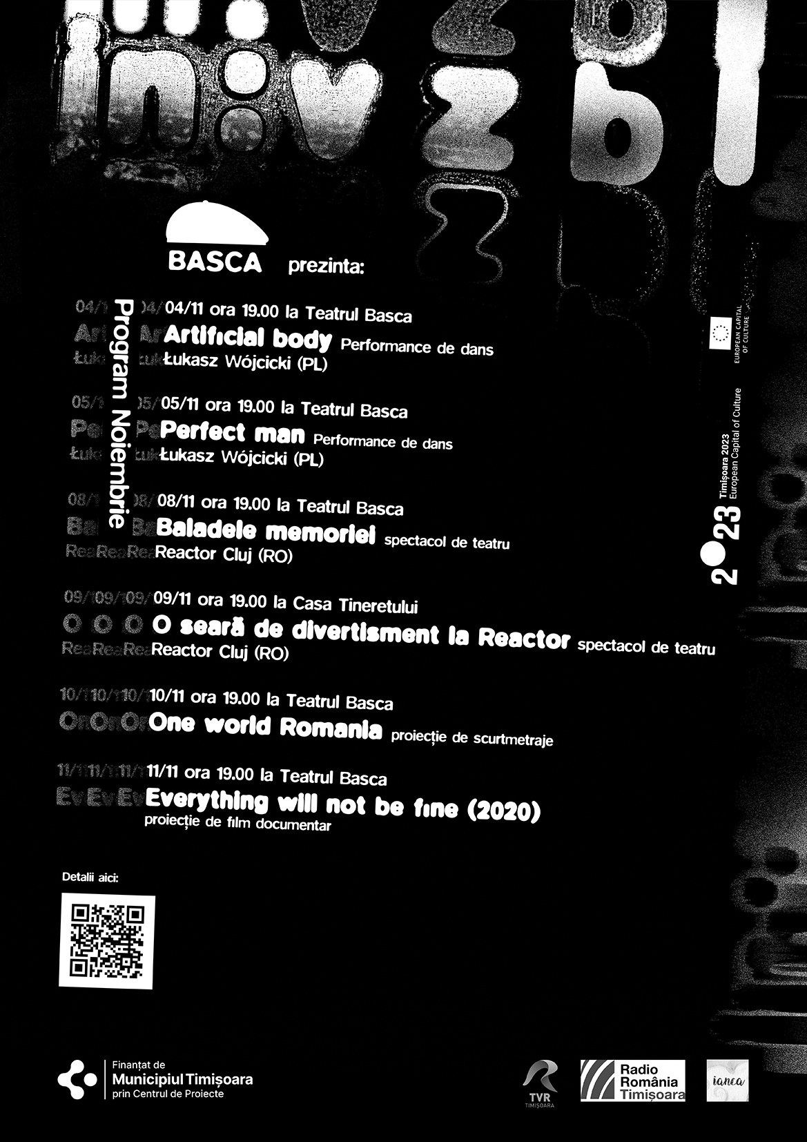 După două luni în care sala teatrului Basca a văzut mai mult public ca în orice alt an, luna noiembrie marchează finalul Festivalului in : v z b l , parte din programul cultural Timișoara Capitală Europeană a Culturii 2023.