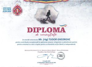 Asociația Națională Cultul Eroilor ”Regina Maria ” din județul Hunedoara, prin președintele Ioan Dorel Șchiopu i-a fost înmânată o diplomă de recunoștință ”pentru contribuția excepțională la apărarea ONOAREI, DRAPELULUI ȘI PĂMÂMTULUI PATRIEI, pentru EROISMUL cu care a luptat pentru ca România să fie LIBERĂ și INDEPENDENTĂ”.