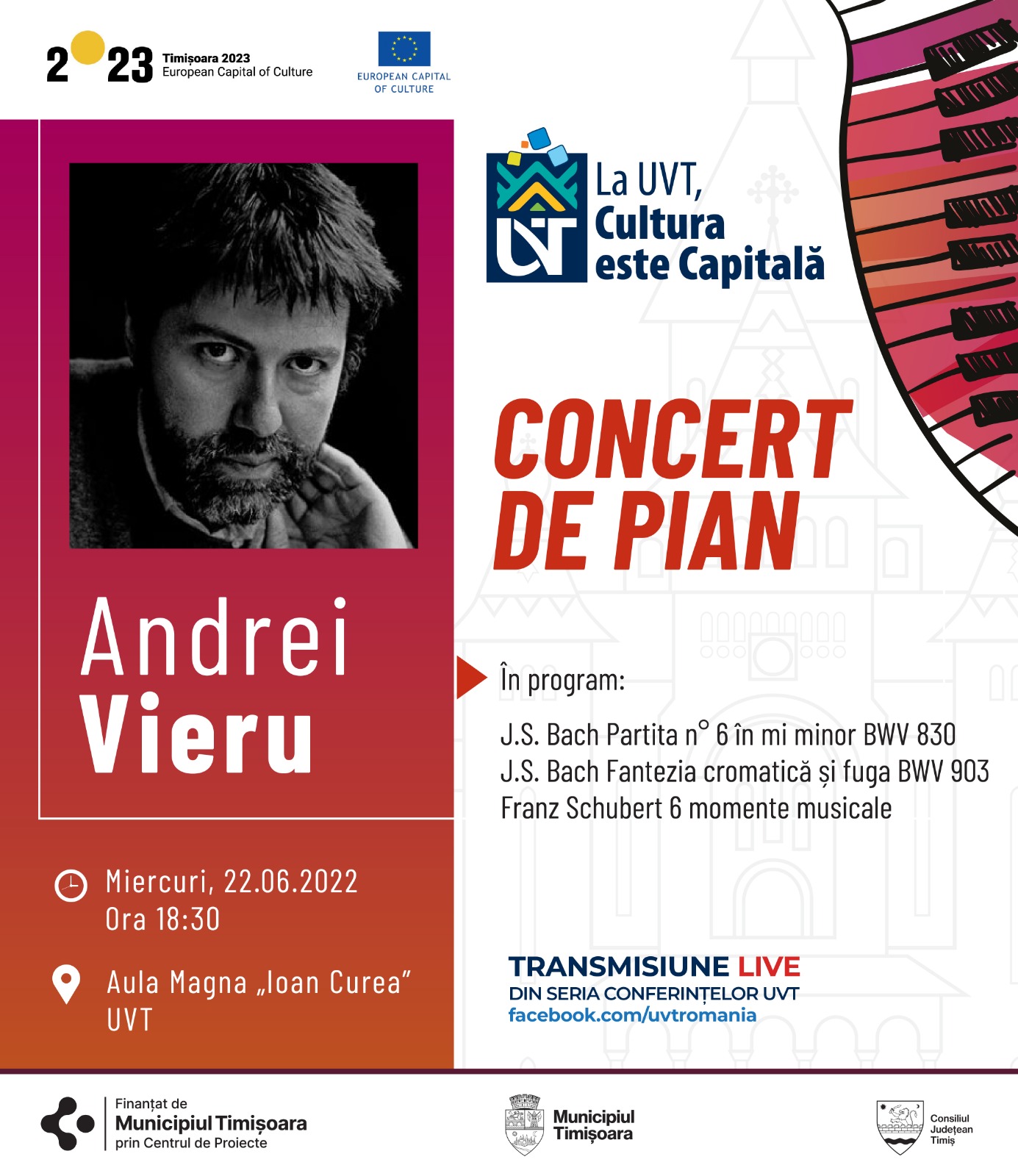 Miercuri, 22 iunie, începând cu ora 18:30, Andrei Vieru, unul dintre cei mai importanți pianiști ai României, ne va încânta cu un concert aparte de pian, organizat în Aula Magna a Universității de Vest din Timișoara.