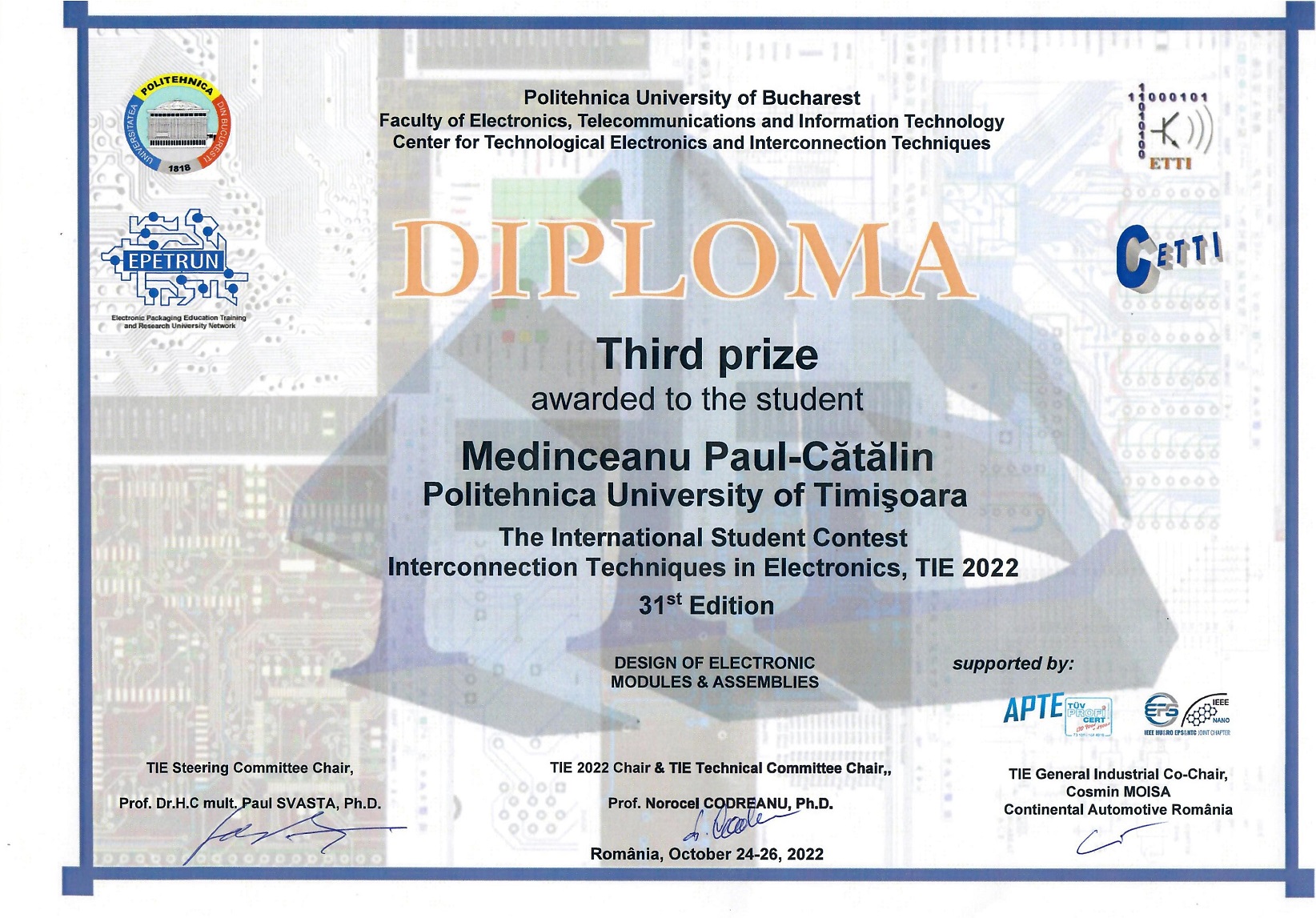 La sfârșitul lunii octombrie 2022, la Biblioteca Centrală a Universității Politehnica București, s-a desfășurat cea de-a 31-a ediție a concursului Tehnici de Interconectare în Electronică – TIE, competiție ce implementează certificarea de către mediul industrial a competențelor studenților de a proiecta pe calculator (Computer Aided Design – CAD) o structură de interconectare (Printed Circuit Board – PCB) pentru un modul electronic complex, un reprezentant al Universității Politehnica Timișoara obținând un meritoriu loc III.