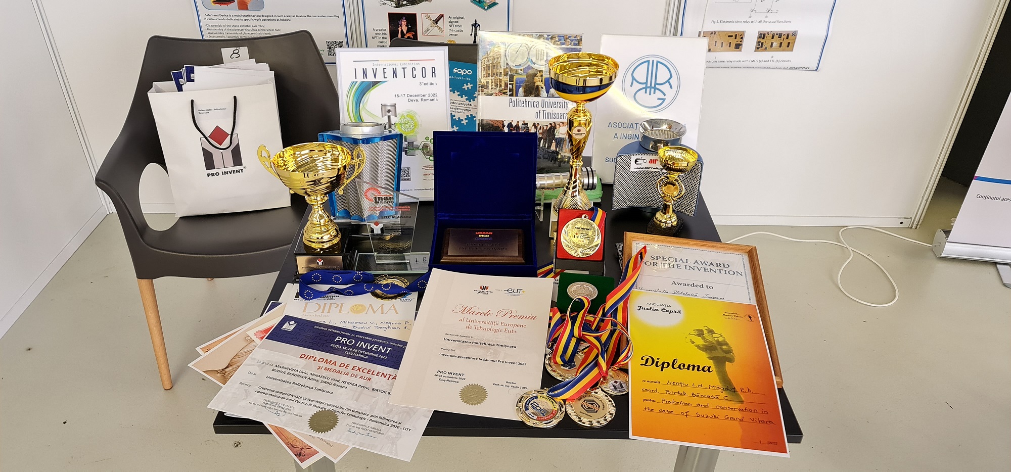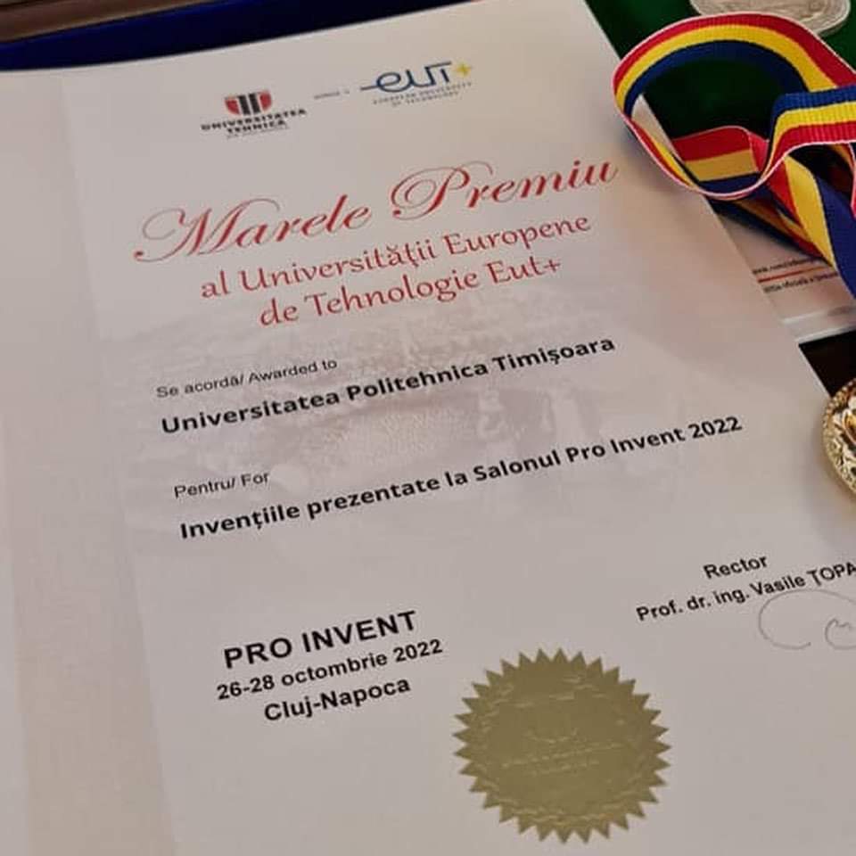 Creativitatea echipei CITT-UPT a fost recunoscută la a XX-a ediție a Salonului Internațional Pro Invent 2022, cu adevărat meritorie fiind obținerea Marelui Premiu al Universității Europene de Tehnologie EUt+, o alianță de 8 instituții de învățământ superior din domeniul tehnic care încearcă să armonizeze activitatea pedeagogică și de cercetare a universităților partenere.