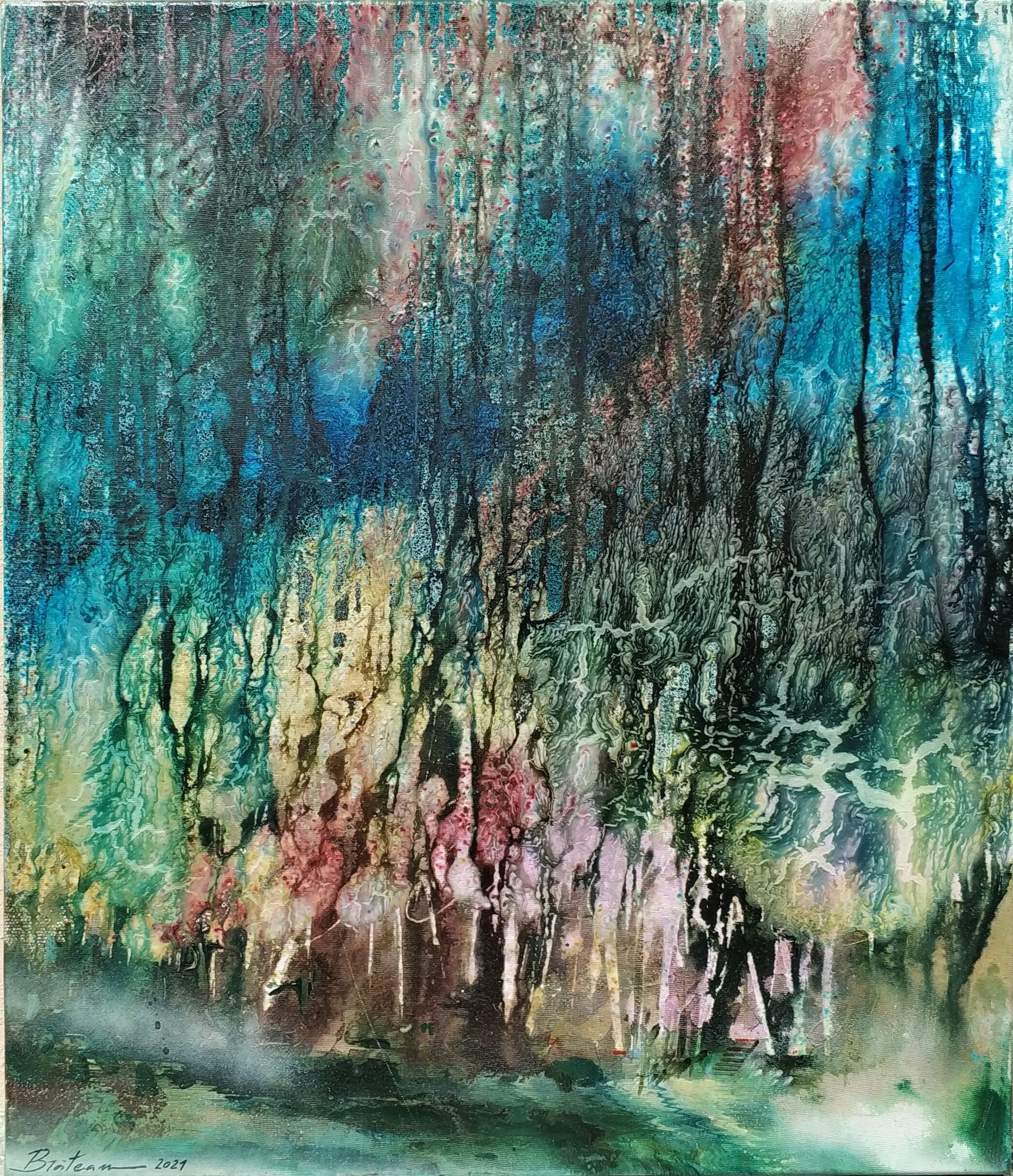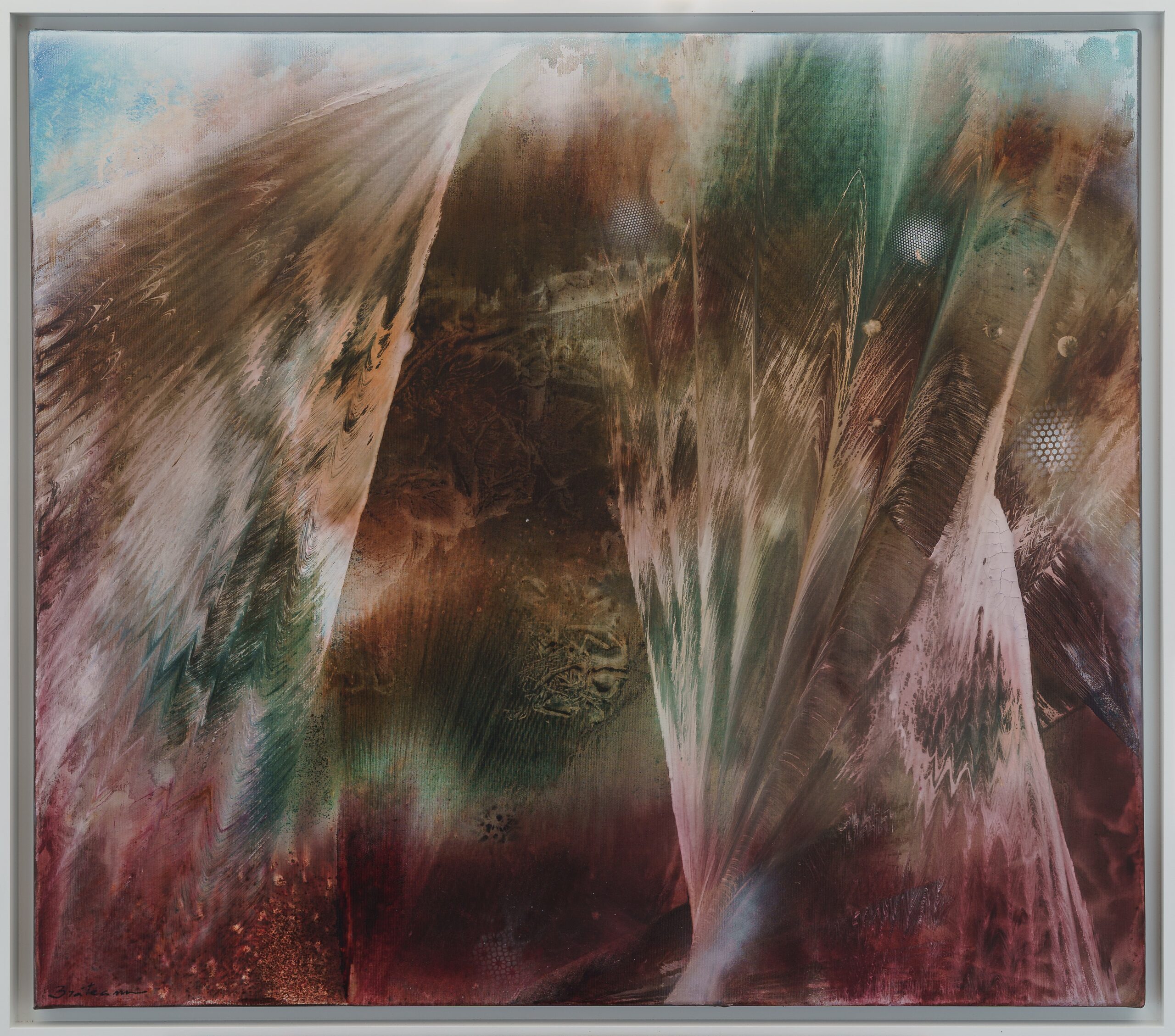 După cum spuneam, viteza amețitoare favorizează nașterea acestor mostre de artă autentică. Pe un fundal uneori transparent, alteori destul de sumbru cu o atingere magică de cuțit sau cu o suflare suavă de spray prinde contur sufletul pădurii sau a unui câmp. Această modalitate originală de redare, ne cucerește mai abitir decât o redare realistă a lumii. De fapt curentul realist și-a propus și într-o măsură oarecare i-a reușit să oglindească imaginea exterioară a lucrurilor, care, desigur, într-o măsură mai mare sau mai mică, sugerează să înțelegem și ce a ce nu se vede. Pe când curentele artei moderne, din care face parte și pictura lui Brăteanu a îndrăznit și într-o oarecare măsură le-a reușit, după cum spuneam, să sondeze și să întruchipeze o lume nevăzută. Pentru că aceasta, (să ne amintim de ultima carte a lui Patapievici, Nevăzutul decide totul ) face parte indispensabilă din existența noastră. Și-n mod evident ea este extrem de vulnerabilă și nu ne putem apropia oricând și oricum. Apropierea de inefabil necesită o tehnică aparte și destul de avansată, iar artistul timișorean o însușește cu mult succes.