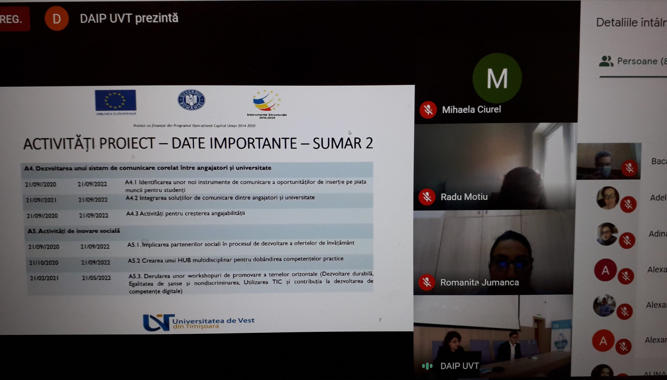 În introducerea conferinței, prof.univ.dr. Flavia Mirela Barna, manager proiect, a precizat: „Suntem o echipă acum consolidată, formată din mulți universitari și experți din UVT și din partea partenerului de proiect, care va urmări un obiectiv strategic, constând în dezvoltarea unui cadru de profesionalizare deschis, orientat spre deprinderea de abilități practice de către studenții UVT, pentru o viitoare integrare de succes pe piața muncii”.