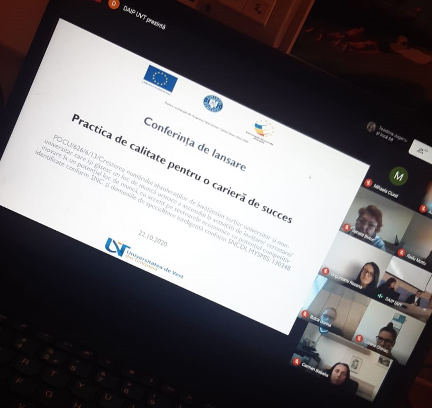 Universitatea de Vest din Timișoara a lansat astăzi, 22 octombrie 2020, proiectul „Practica de calitate pentru o cariera de succes”, proiect care vizează creșterea nivelului de ocupabilitate în rândul a 325 studenți ai Universității de Vest din Timișoara, viitori absolvenți, prin consolidarea serviciilor de practică și prin dezvoltarea abilităților și competențelor practice solicitate de piața muncii.