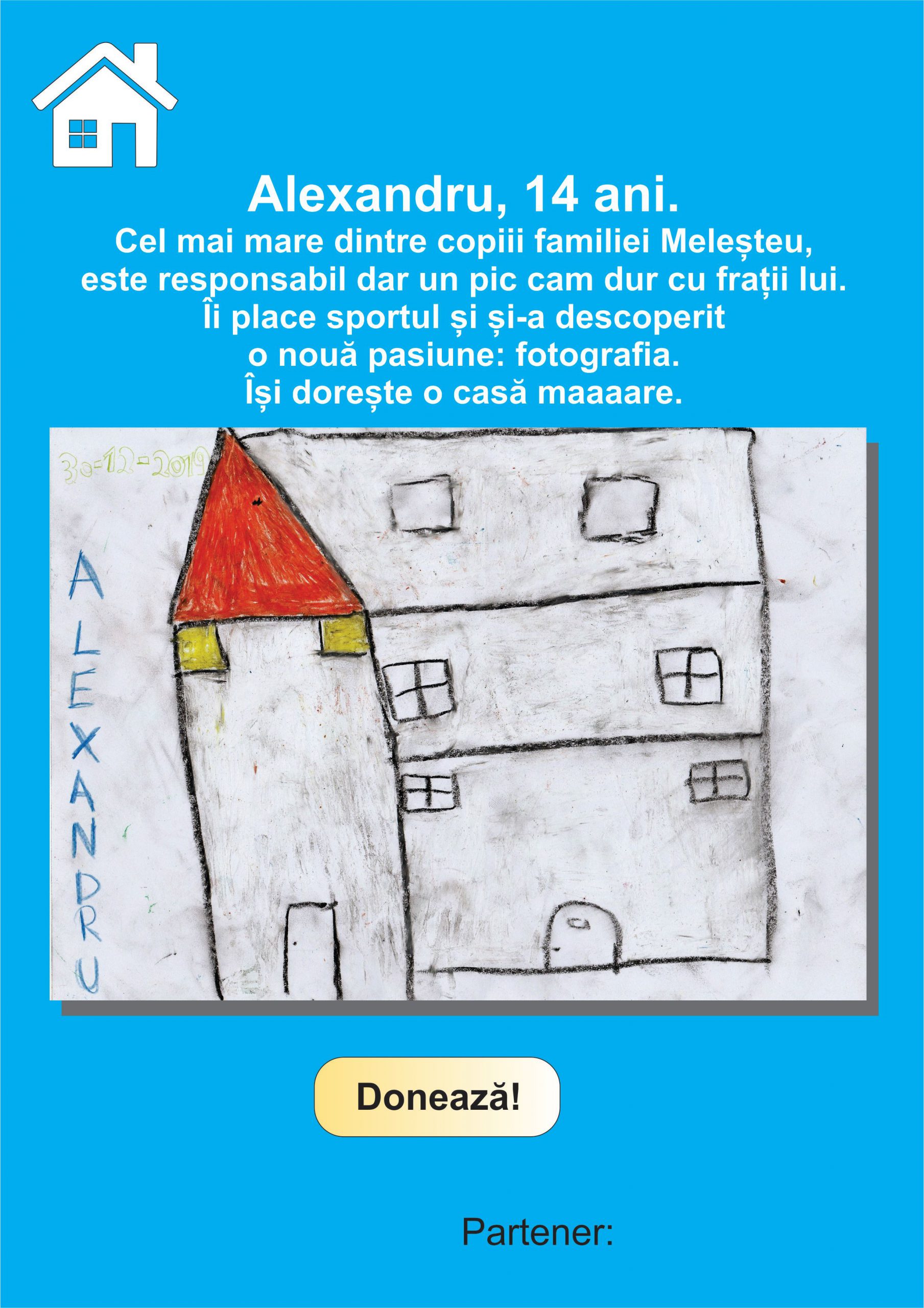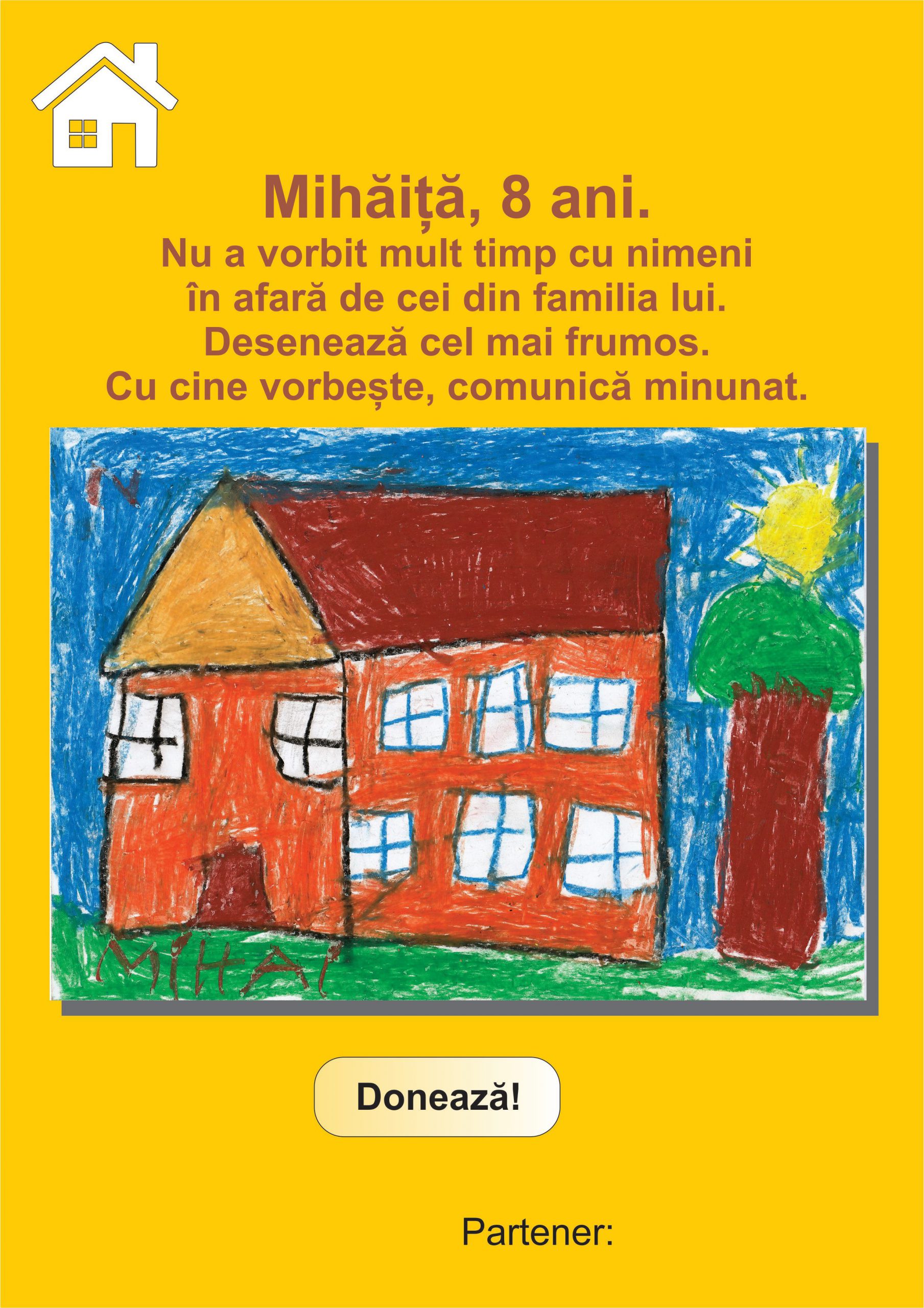 Cei nouă copii ne-au împărtășit din visele lor și ne-au descris, așa cum au știut mai bine, cum arată casa în care și-ar dori să trăiască alături de întreaga familie. Desenele vorbesc singure despre cât de frumoasă este inocența lor, dar și de nevoia de protecție și siguranță pe care un cămin le oferă.