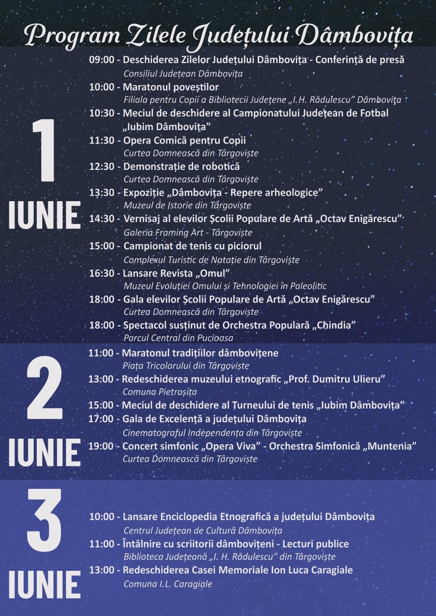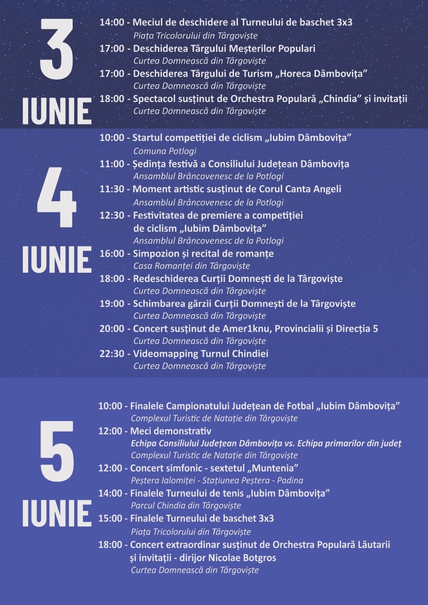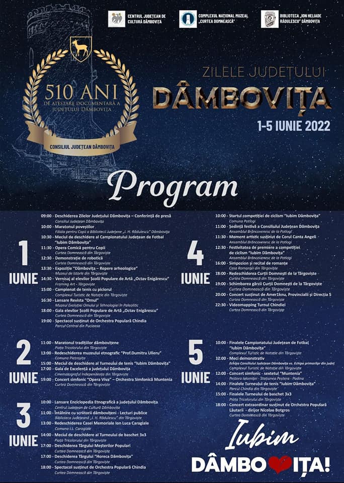 Curtea Domnească, aflată în administrarea CJD, este în centrul acestor manifestări, unde vom avea concerte pe parcursul celor cinci zile. Deschiderea „Zilelor Județului Dâmbovița” va avea loc pe data de 1 iunie, la ora 9:00, și tot pe 1 iunie vom avea deschiderea campionatului de fotbal, care se va desfășura în multe localități din județ. Tot pe 1 iunie vom avea și o gală de premiere a elevilor de la Școala Populară de Artă „Octav Enigărescu”. Pe 2 iunie, vom avea Maratonul tradițiilor dâmbovițene, eveniment organizat de Biblioteca Județeană. Tot pe 2 iunie vom da startul turneului de tenis, la nivelul județului Dâmbovița, iar evenimentul principal al zilei va fi gala de excelență, unde îi vom premia pe cei care și-au adus contribuția pentru județul Dâmbovița, oameni din toate domeniile, care ne reprezintă și astăzi la nivel național și internațional. Pe 3 iunie, vom lansa enciclopedia etnografică a județului Dâmbovița, eveniment organizat de Centrul Județean de Cultură Dâmbovița. Tot pe 3 iunie vom redeschide atât Muzeul „Ion Luca Caragiale”, care a fost în reabilitare, cât și muzeul de la Pietroșița. La ora 17:00, vom deschide Târgul Meșterilor Populari. 4 iunie va fi ziua cea mai importantă, când se împlinesc 510 ani de la atestarea județului Dâmbovița. La ora 11:00 vom avea ședința festivă a consiliului județean, pe care o vom organiza în comuna Potlogi, la Palatul Brâncovenesc. Tot pe 4 iunie, vom redeschide pentru vizitare Curtea Domnească din Târgoviște. Așa cum am promis, în această lună terminăm lucrările de reabilitare pe care le realizăm la nivelul curții domnești. Seara, vom avea un spectacol inedit, cu schimbarea gărzii, un spectacol de muzică ușoară, cu trupe renumite din România. Vom închide seara de 4 iunie cu un spectacol inedit de lasere și filme, care se vor proiecta pe Turnul Chindiei. Pe data de 5 iunie vom avea foarte multe activități de premiere a tuturor turneelor derulate pe parcursul celor cinci zile. De asemenea, vom avea un concert în Peștera Ialomiței. Seara, vom avea un concert folcloric susținut de Orchestra Populară „Lăutarii”, dirijată de domnul Nicolae Botgros, cu artiști din județul Dâmbovița și nu numai. Pe lângă aceste evenimente, vom avea spectacole în mai multe localități, vom avea activități sportive, vom avea un turneu de baschet pe platoul din fața Consiliului Județean Dâmbovița, un turneu autorizat de Federația Română de Baschet, vom avea un spectacol la Casa Romanței și alte surprize, pe care o să le anunțăm în perioada următoare”.