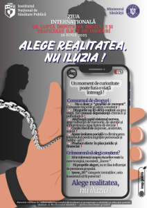 Institutul Național de Sănătate Publică se alătură astăzi, 26 iunie, acțiunilor organizate la nivel mondial pentru marcarea Zilei Internaţionale de Luptă Împotriva Abuzului şi Traficului Ilicit de Droguri, cu scopul de a contribui la o înțelegere deplină a fenomenului, conștientizarea populației și focalizarea atenției asupra riscurilor asociate creșterii alarmante a consumului de droguri la nivel global, european și național, cu implicații semnificative asupra sănătății publice și securității societății. La campaniile INSP partener este și CLUBUL DE PRESĂ VALEA JIULUI, care derulează alături de ASOCIAȚIA PACIENȚILOR din județele Timiș și Hunedoara CAMPANIA VIAȚĂ PENTRU MAREA FAMILIE DE PACIENȚI.