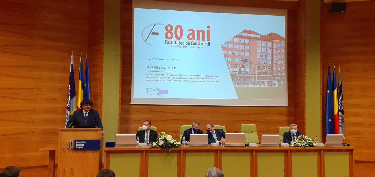 Aniversarea celor 80 de ani de la înființarea Facultății de Construcții a avut loc tot în Auditorium-ul Centrului de Conferințe al Universității Politehnica Timișoara și tot în regim hibrid, cu o prezență fizică redusă, impusă de condițiile epidemiologice, dar cu o serie de invitați care au transmis online mesajele lor.